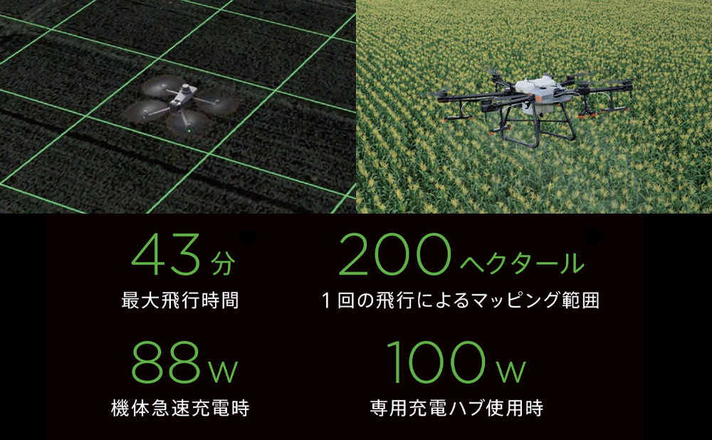最大43 分のバッテリー寿命で、1回のフライトで200 ヘクタールの広大なエリアの測量・地図作成作業を完了させることができます。